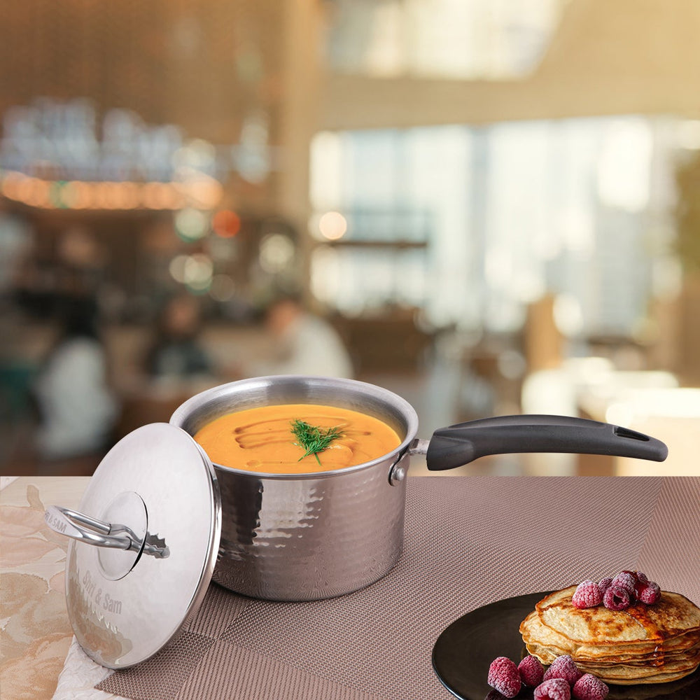 This 430 Sauce Pan with Lid by Shri and Sam is built with premium and heavy quality stainless steel, thickness - 1.5 MM which is rust free and highly durable. This Sauce Pan is in steel color and has a shiny finish to it which makes it suitable for any type of kitchen. This Sauce Pan is hand-hammered which makes it even beautiful. This product can be a perfect add on to any cookware collection. This Sauce Pan can be a treat for Indian cooking, also it suits all types of cooking styles. This Sauce Pan also has a modern yet elegant design that rests the kitchen tool easily. The shape is designed in a manner to make sure cleaning and maintaining this Sauce Pan is very easy.
