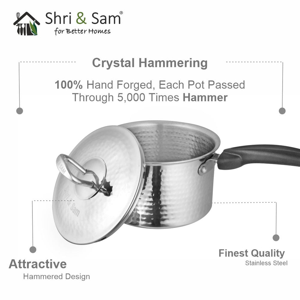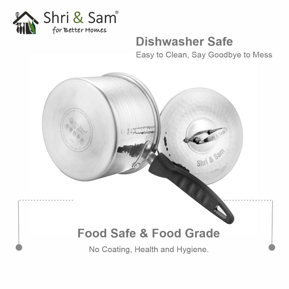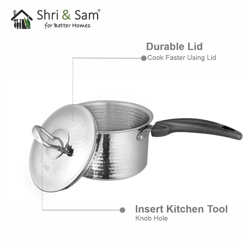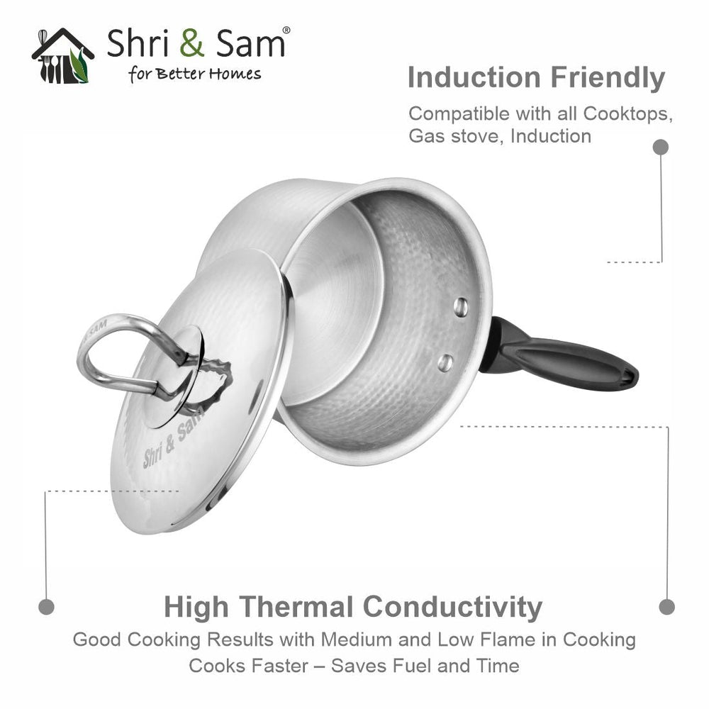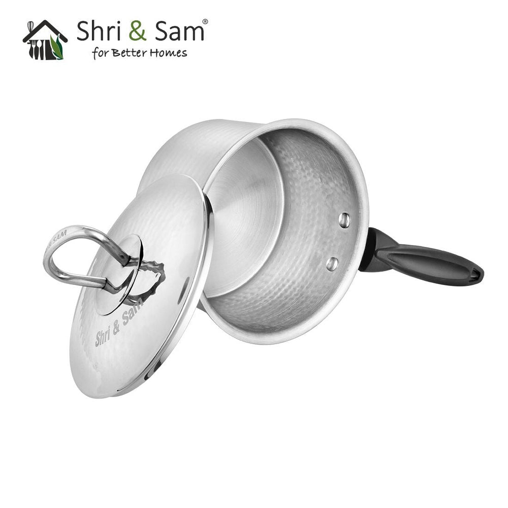 This 430 Sauce Pan with Lid by Shri and Sam is built with premium and heavy quality stainless steel, thickness - 1.5 MM which is rust free and highly durable. This Sauce Pan is in steel color and has a shiny finish to it which makes it suitable for any type of kitchen. This Sauce Pan is hand-hammered which makes it even beautiful. This product can be a perfect add on to any cookware collection. This Sauce Pan can be a treat for Indian cooking, also it suits all types of cooking styles. This Sauce Pan also has a modern yet elegant design that rests the kitchen tool easily. The shape is designed in a manner to make sure cleaning and maintaining this Sauce Pan is very easy.