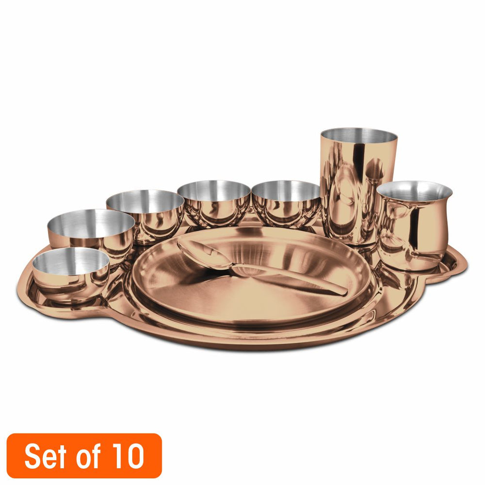 This Shri and Sam thali set is a complete set that has a shiny finish to it. This thali set is a premium product that could be an ideal choice when guests come home. This beautiful thali set lets you serve every meal with pride and in an organized fashion. This product is ideal for any kind of table setting. This product is made from high-quality stainless steel and is durable enough that it will not bend or break. Moreover, it is really easy to clean this thali set. This thali set can nest anywhere in your kitchen as it does not take much space.