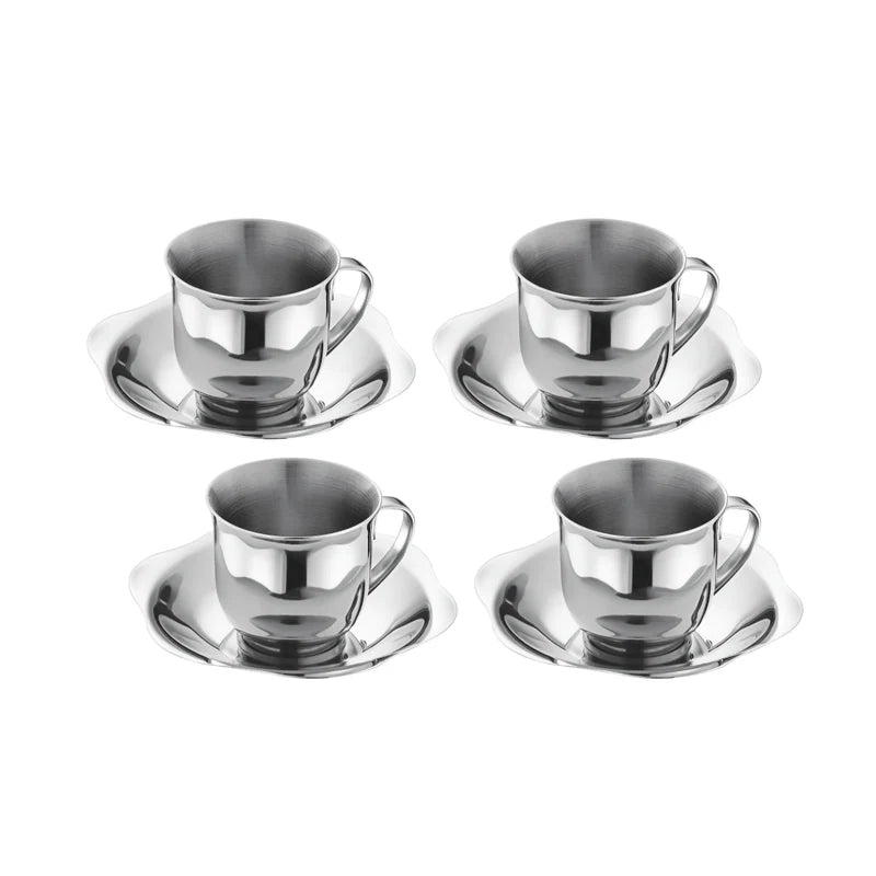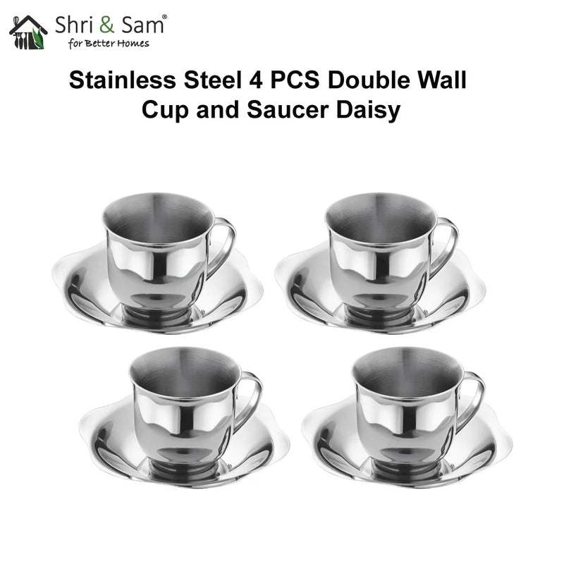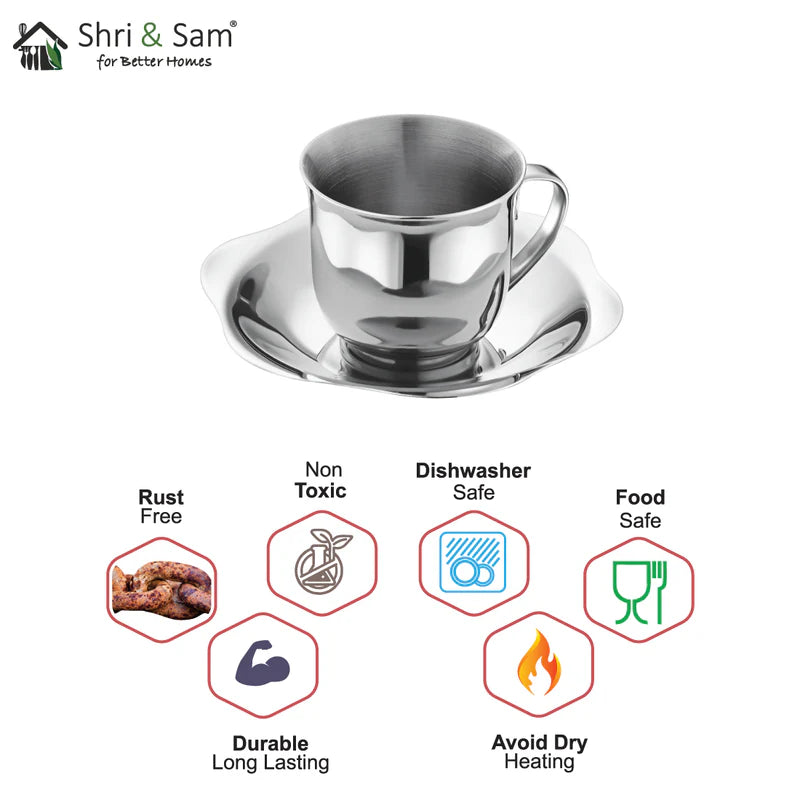 Shri and Sam present serve hot beverages to your guests in style with this Cup and Saucer Set. Made from premium quality stainless steel, the double-wall helps to serve tea or coffee. This set is silver in color, which has a mirror finish on the outside and matt finish on the inside. This product will not break or bend easily, is highly durable, which makes it excellent for everyday use. This set by Shri and Sam will certainly get you compliments when you place in front of a guest. Its beautiful design allows it to grip the hands very easily. This set is 100% food-safe, that allows it to not react with the food. With this price, this is a must-buy set for any kind of kitchen, as it will be a huge plus in your serve ware category.