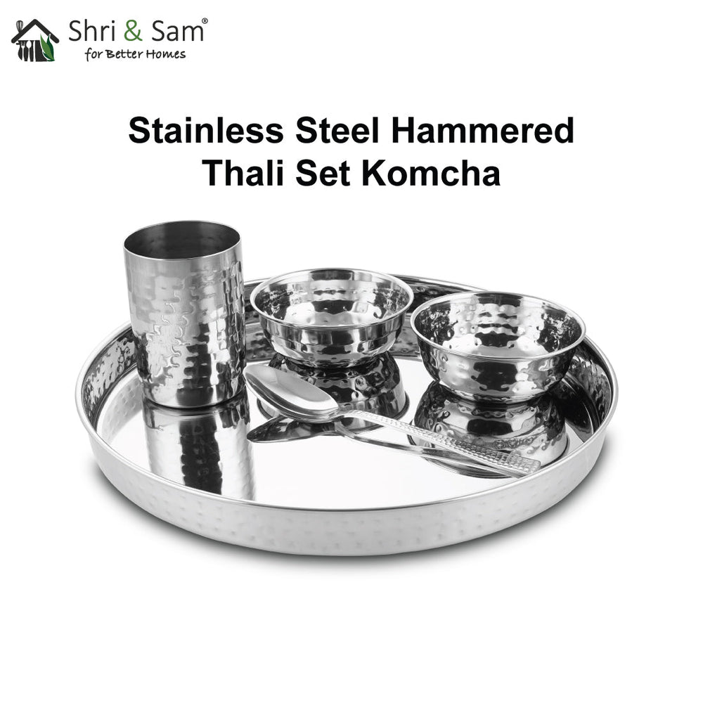 This Shri and Sam Hand-hammered Thali Set is made from premium quality stainless steel that can last a very long time. This thali set has a shiny finish which can make it look great on any type of table. This thali set is perfect for 1 person. This can be a great add on to your dinnerware collection. This product can also be gifted to anyone on different occasions. This dinnerware set is a great option to serve your guests or friends. If you care to sit with your family and have a warm meal then this thali set is good for you. Its hammered finish makes it look elegant and gives it a royal finish.