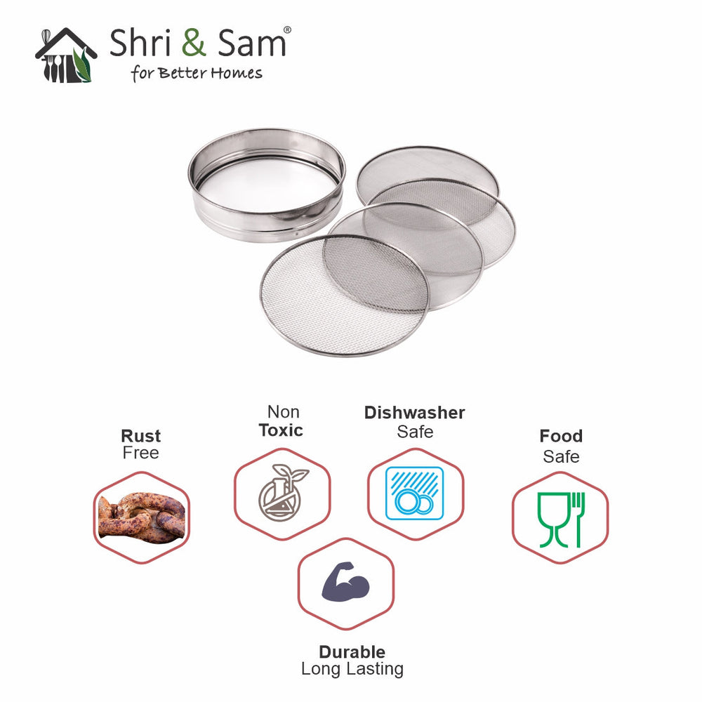 This Interchangeable Sieve/Chalni/Mesh with Holder by Shri and Sam is built with Stainless steel material which is rust-free, hygienic, and durable. This sieve is designed to strain flour, maida, masala, peas flour, and more.