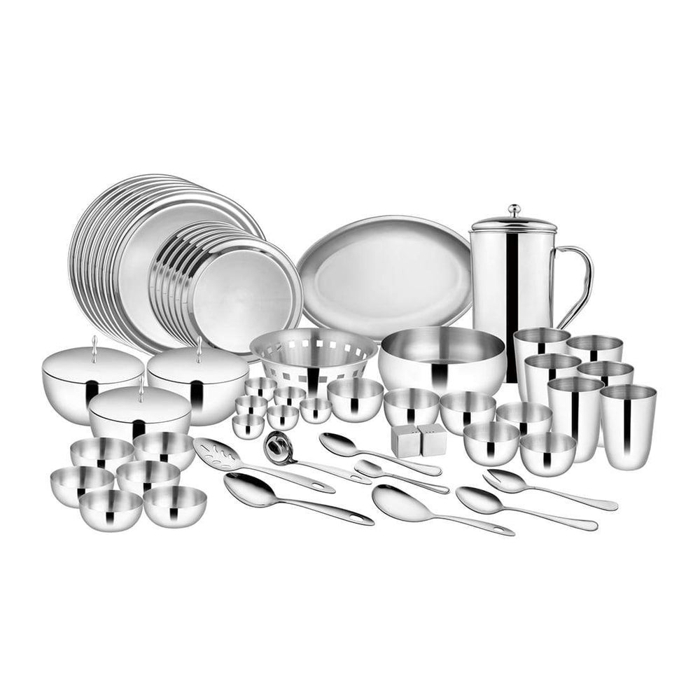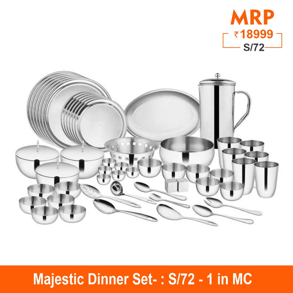 This Shri and Sam 72 PCS Dinner Set will make a perfect utility item while adding a stylish edge to your dinner table, this set is made from high-quality stainless steel making it exclusive and durable, beautifully designed to add grace to your dining experience also strong in construction and will not bend or have dents during normal use. This set can be nested one into another and therefore helping save shelf space in the kitchen perfect for all kitchen needs. This dinner set can be the ideal gift and can be a beautiful host to your guests. This quality stainless steel is made from premium quality raw material and this dinner set is very easy to clean. The dinner set has a shiny finish to it and it will magnify the look of any dinner setting.