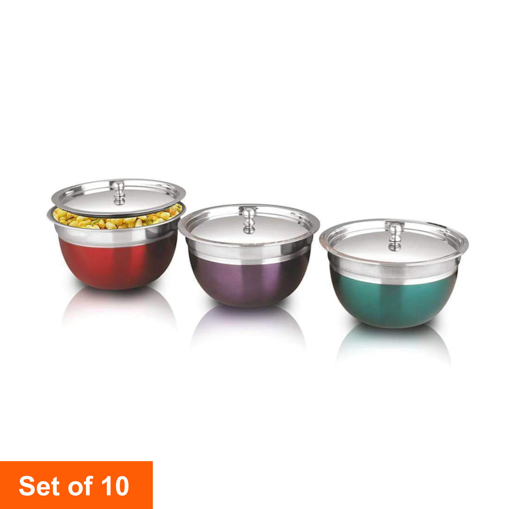 Boost your kitchen decor and also ensure a healthy way of life by bringing home magnificent stainless steel storage and serving set that has different colored bowls. Made of premium, food-grade quality stainless steel, the storage and serving set prevents food contamination. A mirror finish assures this set a lavish look that will surely make your dining experience with family and friends memorable. The containers have lids made with stainless steel and are unbreakable. Moreover, this kitchenware is nestable, saving you space in your kitchen cabinets. This serving bowl set can be used for other purposes as well like we can put dry fruits in it, since this is a food-grade, you can keep dry fruits in it for long time periods as well without hampering the food. This is also a very great option when guests come home, as it beautifies the table as well. Since this serving bowl set is pocket friendly, it could be a great add on to any kitchen or a gift option for family and friends.