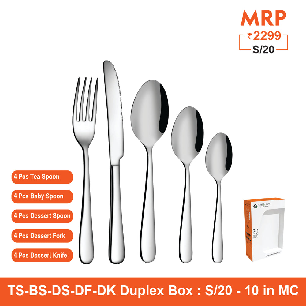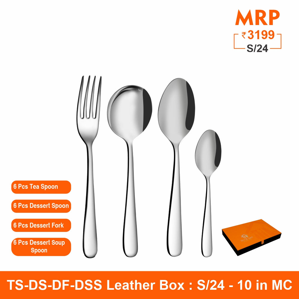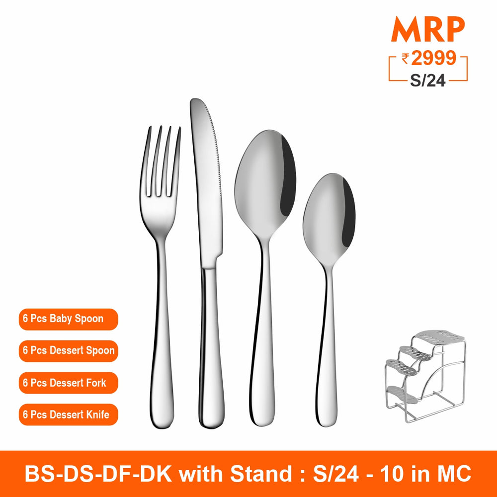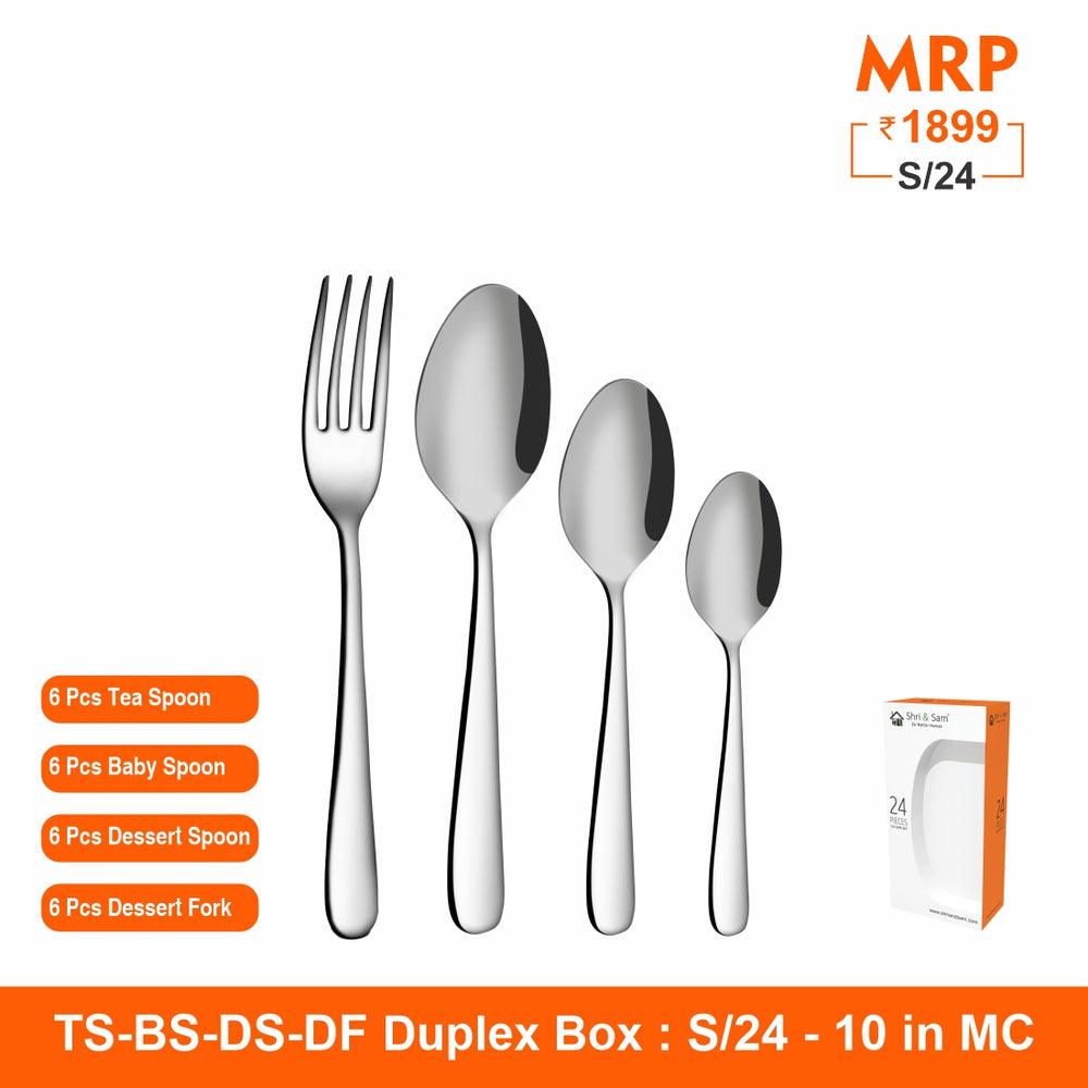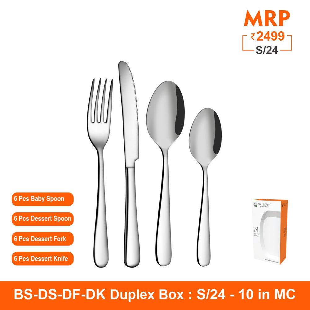Revive your table with the Shri and Sam Monika cutlery set. This product has a two tone finish that gives it grace along with the classic shape that allows it to coordinate effortlessly with an existing tableware theme, this makes it the most sold cutlery set outside India. This cutlery set is made with the best quality stainless steel and it has a mirror finish. The thickness of this cutlery set is appropriate and this is designed to ease out your dinning experience since this is cup rolled. This cutlery set is a must have for everyday use as it adds style to your dinner setting.