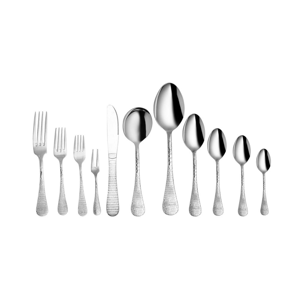 New Rosemary Hammered series by Shri and Sam has this exclusive cutlery set in it, this cutlery set is silver in color and has a shinny finish to it. This is made by the ideal raw material which makes it a very stable product. This cutlery set has a medium thickness to it which is far better than the day to day cutlery sets used in Indian households. This cutlery set has a circle pattern design, that is hammered on the handle. This quality silverware brings easyness and affordable elegance to your table. This product could be an ideal choice for both, modern and classic tables.