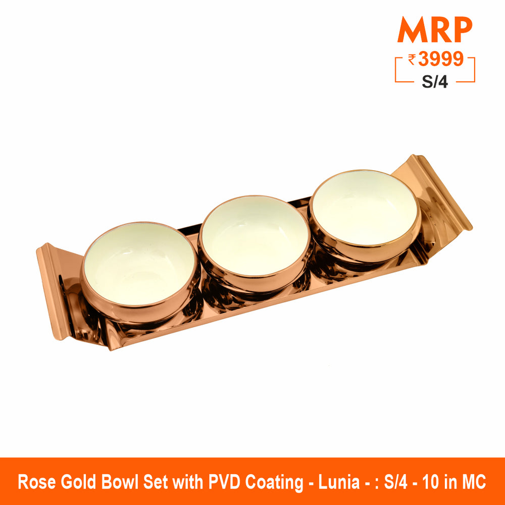 This Shri and Sam Lunia bowl Set is made from high quality stainless steel that has shiny finish on the outside. This product will ease the way you serve and would be a great addition to your kitchenware as this product looks elegant and is simple enough to suit any kind of table or kitchen. This Bowl set is completely food safe and you can serve food like rice, daal, sabzi in it as well. This bowl set has a white color on the inside which elaborates its beauty and this is definitely the perfect choice to impress any guest. This product also comes with a stainless steel tray that is pretty in looks and rightly designed. This bowl set can also be a perfect gift for small occasions. Lunia bowl set is a very durable product and it can also be cleaned and maintained easily. This serving set would be ideal enough for serving of 3-4 people and is perfect to serve with tea and coffee. This can go really well with Shri and Sam's Nikki Dinner Set or Nifty Thali Set.