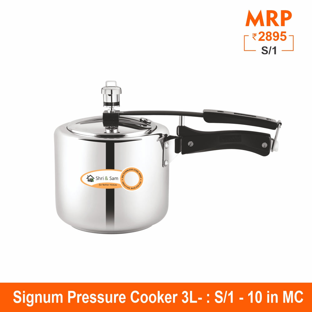 ▩ This Shri and Sam Signum Pressure Cooker is a 304 grade stainless steel made body that is silver in color and has Matt finish to it. This pressure cooker is designed in a manner so that it feels always light to pick it up and moreover the Matt finish holds the body together that makes it very durable product.