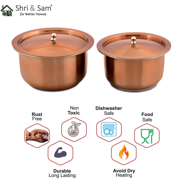 This Copper Tope Set by Shri and Sam is built with superior quality stainless steel which makes the product durable enough to last a very long time. This product has a shiny finish on the outside with copper color on it which makes it beautify any kind of table setting while serving. The inside has a matt finish, silver in color and it is perfect for your food since it's completely food safe. This set also comes with stainless steel lids that too have a shiny copper finish on the outside while they are matt silver on the inside. This set is an ideal choice for all types of homes as it can be used for both cooking as well as serving. You can cook all types of soups in it, masalas for Indian curries, warm milk and other types of liquids. This product is also induction friendly which gives it an advantage over other cook and serve products. Moreover, it can serve a lot of things even apart from that. These copper tope set, would be good enough for serving 5-6 people. This set has the right weight balance and gives you no pain in either cleaning it or maintaining it.