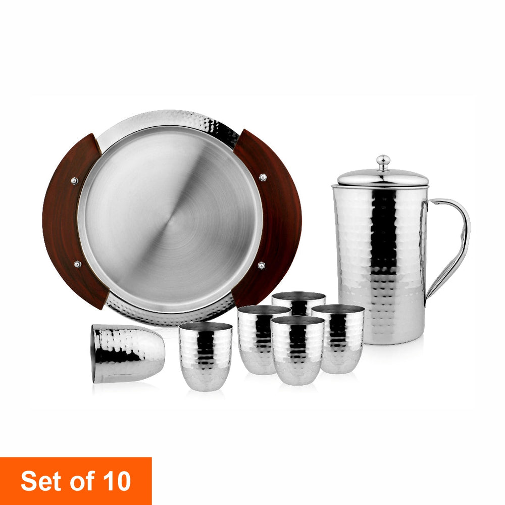 Get yourself this Shri and Sam Lemon Set that is made from premium quality stainless steel that consists of 6 glasses, 1 jug, and a tray, that will add value to your table. This hammered lemon set has ultimate looks and superior quality which assures its durability. This hammered lemon set is built in an innovative way that will be a different and refreshing experience since its got a mirror finish and is 100% food grade. This Shri and Sam hammered lemon set has very attractive glasses with a unique design and the tray has got wooden sides that makes look subtle yet elegant. This product can be perfect for everyday use to serve several drinks in it. This lemon set is a must-have for all kinds of tables and can be a great gift for several occasions as well.