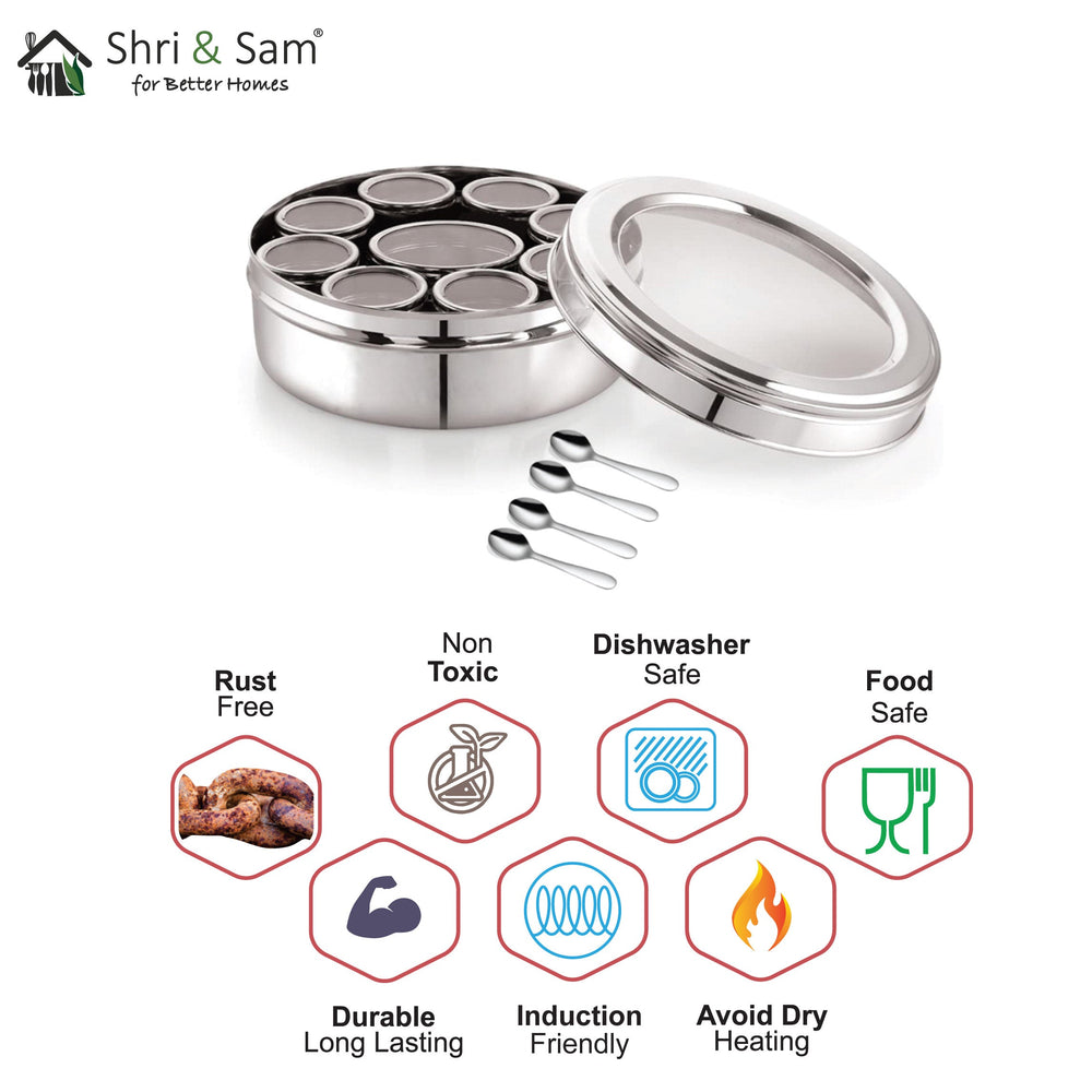 This Masala Box or Dabba by Shri and Sam is commonly used to keep spices such as cumin seeds, cardamom, garam masala, turmeric powder, red chilies, amchur powder, coriander powder, and much more! This masala Dabba is made from premium quality stainless steel which has a shiny finish and it looks elegant in all types of kitchens. A stainless steel spice box (masala Dabba) is vital to anyone serious about cooking authentic Indian food, no Indian cook would be without one. This masala box is completely food grade and this is made from superior raw material which makes it highly durable and rust-free.